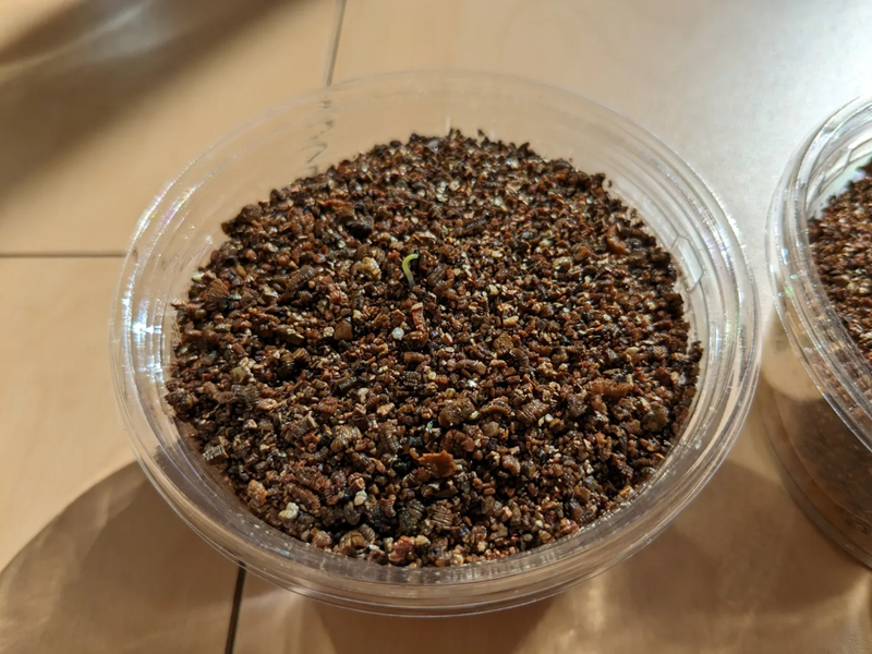 10月上旬に種をまき、5日目にしてようやく1つ発芽しました。20℃ほどの室内で管理しています。