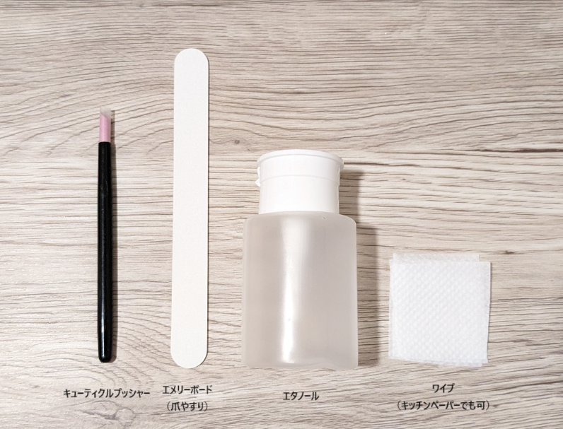 ①キューティクルプッシャー:爪まわりの甘皮を押し上げるのに使います。(100均で購入) ②エメリーボード:爪の長さや形を整えるのに使います。(100均で購入) ③エタノール:爪表面の汚れや油分を拭き取るのに使います。 ④ワイプ:エタノールをしみこませて使います。キッチンペーパーでもOKです。