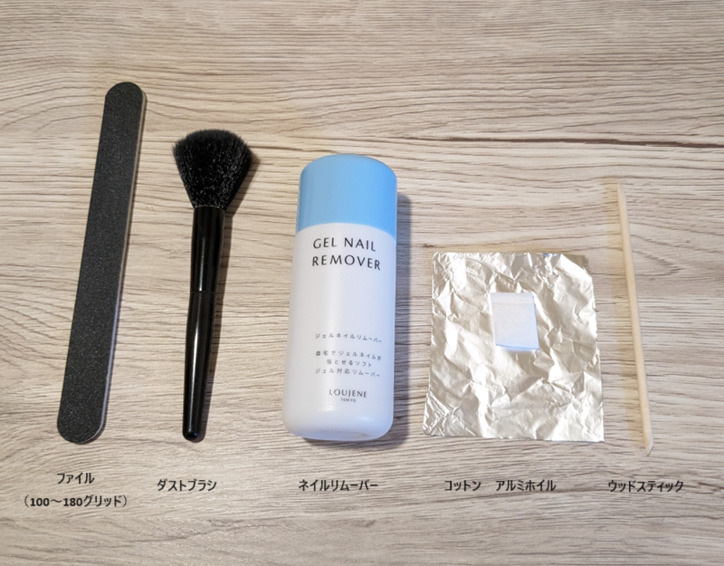 ①ファイル:ジェルの表面を削るのに使います。(100均で購入) ②ダストブラシ:削ったジェルを払うのに使います。メイクブラシでもOKです。(100均で購入) ③ネイルリムーバー:ソフトジェルの除去に使います。(100均で購入) ④コットン:ネイルリムーバーをしみこませて使います。(100均で購入) ⑤アルミホイル:コットンが乾燥しないように指にくるんで使います。(100均で購入) ⑥ウッドスティック:柔らかくなったジェルの除去に使います。(100均で購入)