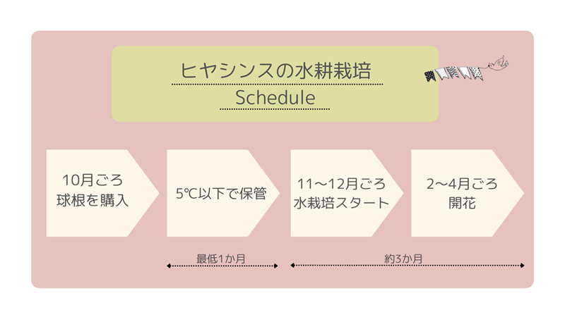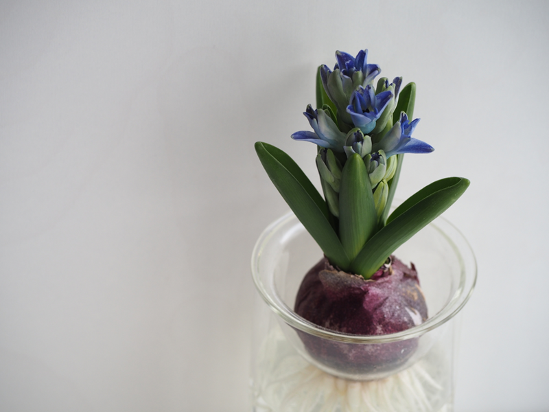 購入後は1か月以上寒さに当て、11月~12月ごろに水栽培を始めれば、2~4月のヒヤシンスの開花期に合わせて花を楽しめます。