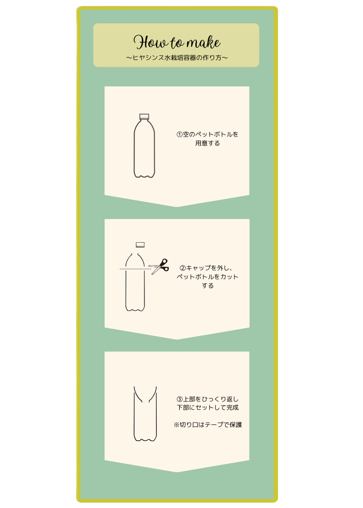 空のペットボトルを使って、水栽培用の容器を作ることができます。