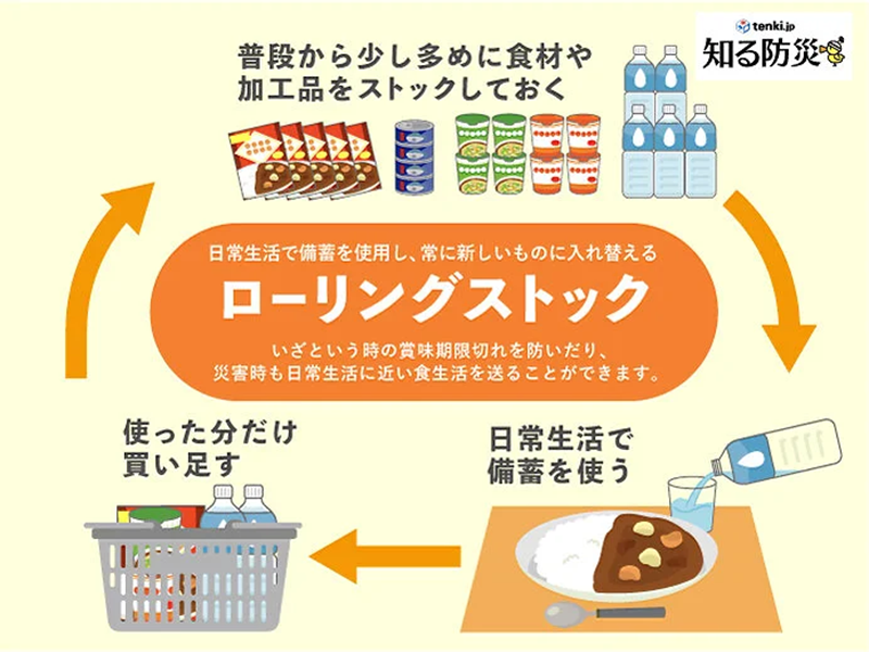 ローリングストックとは、普段使う食品を多めに買い置きし、古いものから消費して使った分を買い足す保存方法のことです。