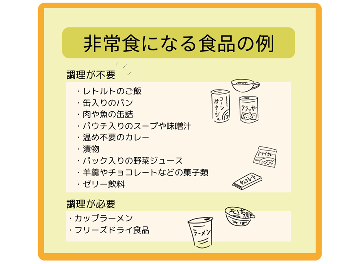 非常食とは、災害が発生し一定期間食料の調達が困難になった時に備えて、平常時に準備しておく食料のことです。